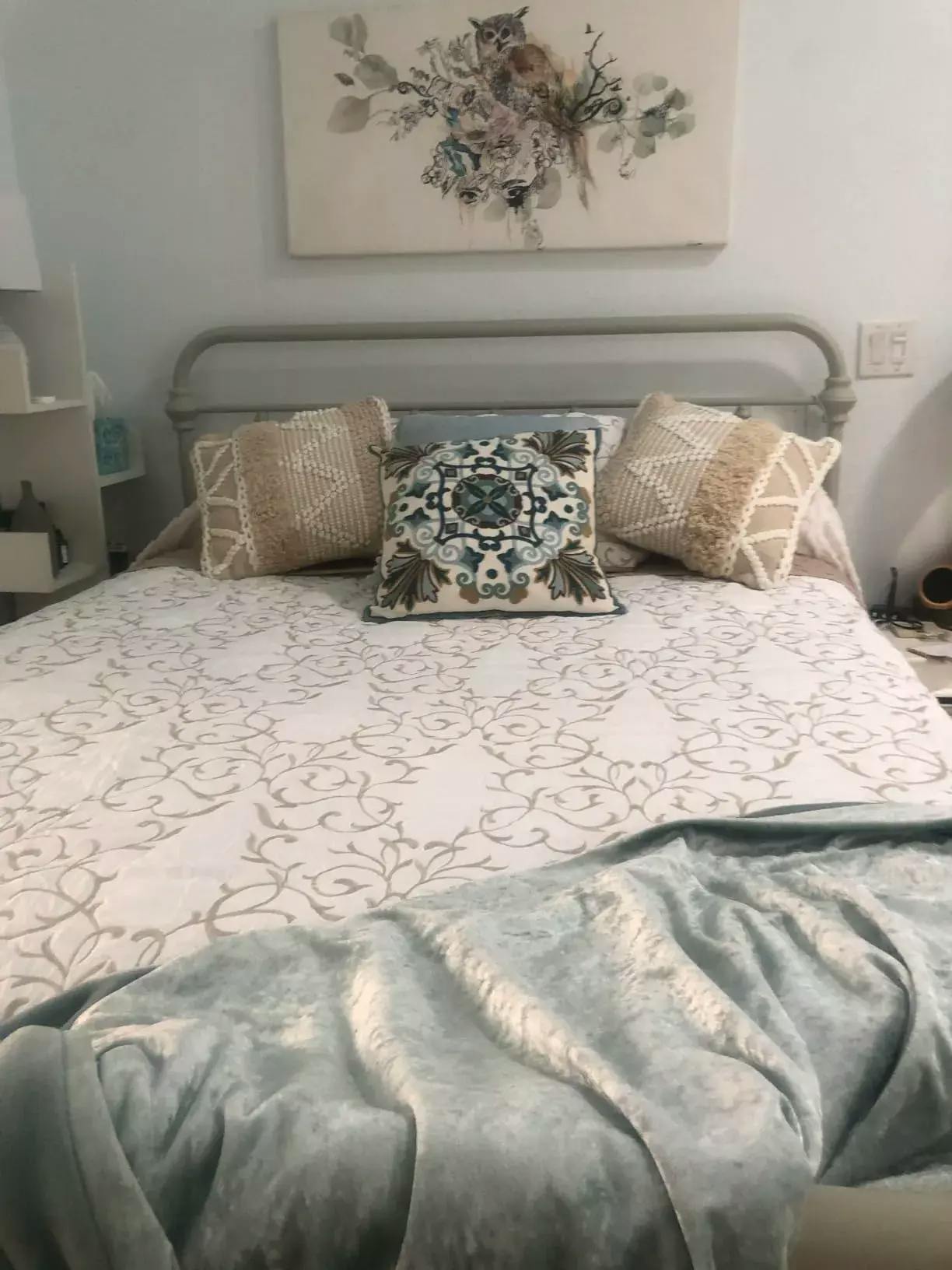 I just love this. I have been searching for the right spread to go with my boho spa bedroom. This is perfect! I ordered a King as my Queen bed is quite high. It is still a bit short but I left my lightweight chenille it is a underneath and it looks good. I am soooooo happy with this bedspread so far. I hope it launders well. It is bright white with a nice neutral beige not too pink or too gold.